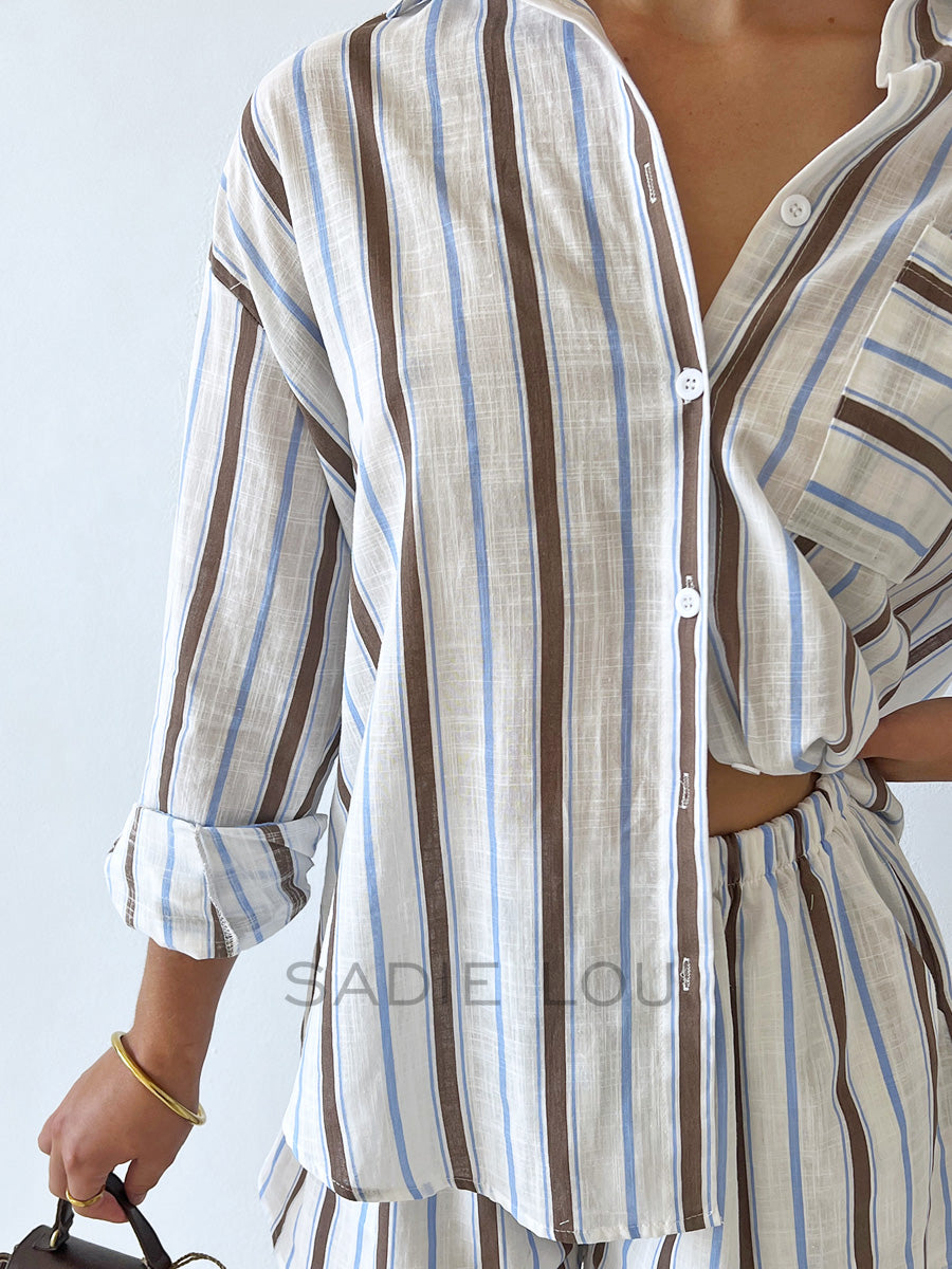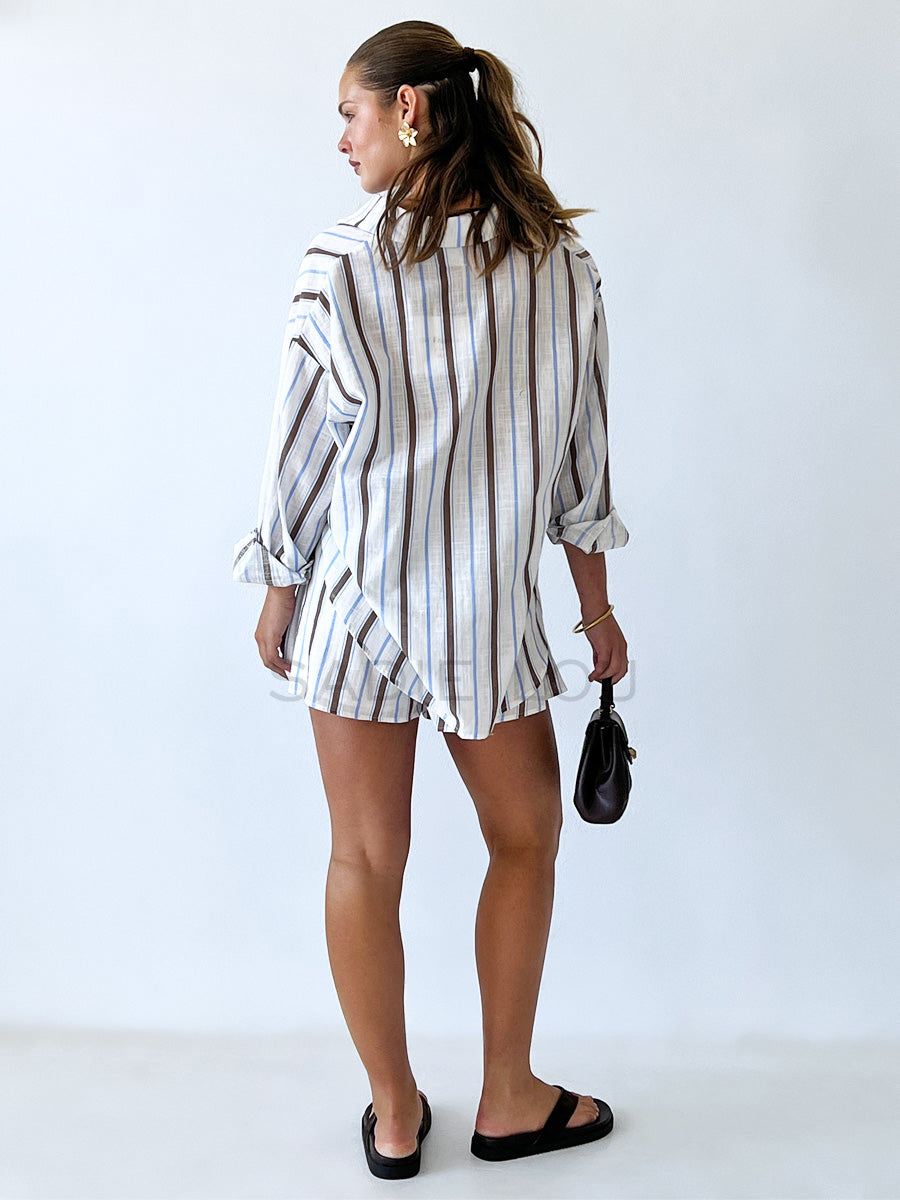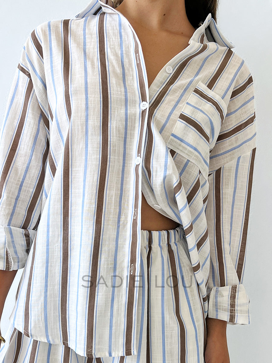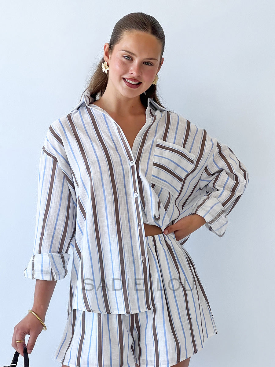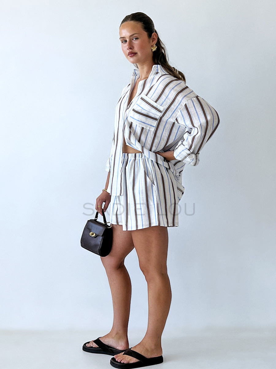 This matching short set is crafted from the same cobalt blue and white striped 100% cotton fabric, offering a fresh, coastal-inspired look with a soft, breathable feel. Thoughtfully designed, the set combines relaxed comfort with a refined, put-together silhouette.