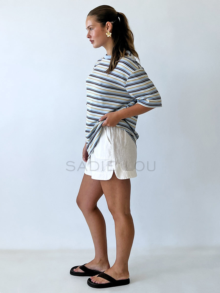 Elevate your casual wardrobe with this stylish striped tee featuring a crisp blue trim collar. The lightweight fabric blends 95% polyester and 5% spandex, offering a soft, comfortable stretch that moves with you. The tee showcases a sophisticated stripe pattern in light blue, dark blue, chocolate, white, tan, and taupe—perfect for layering or wearing on its own.
