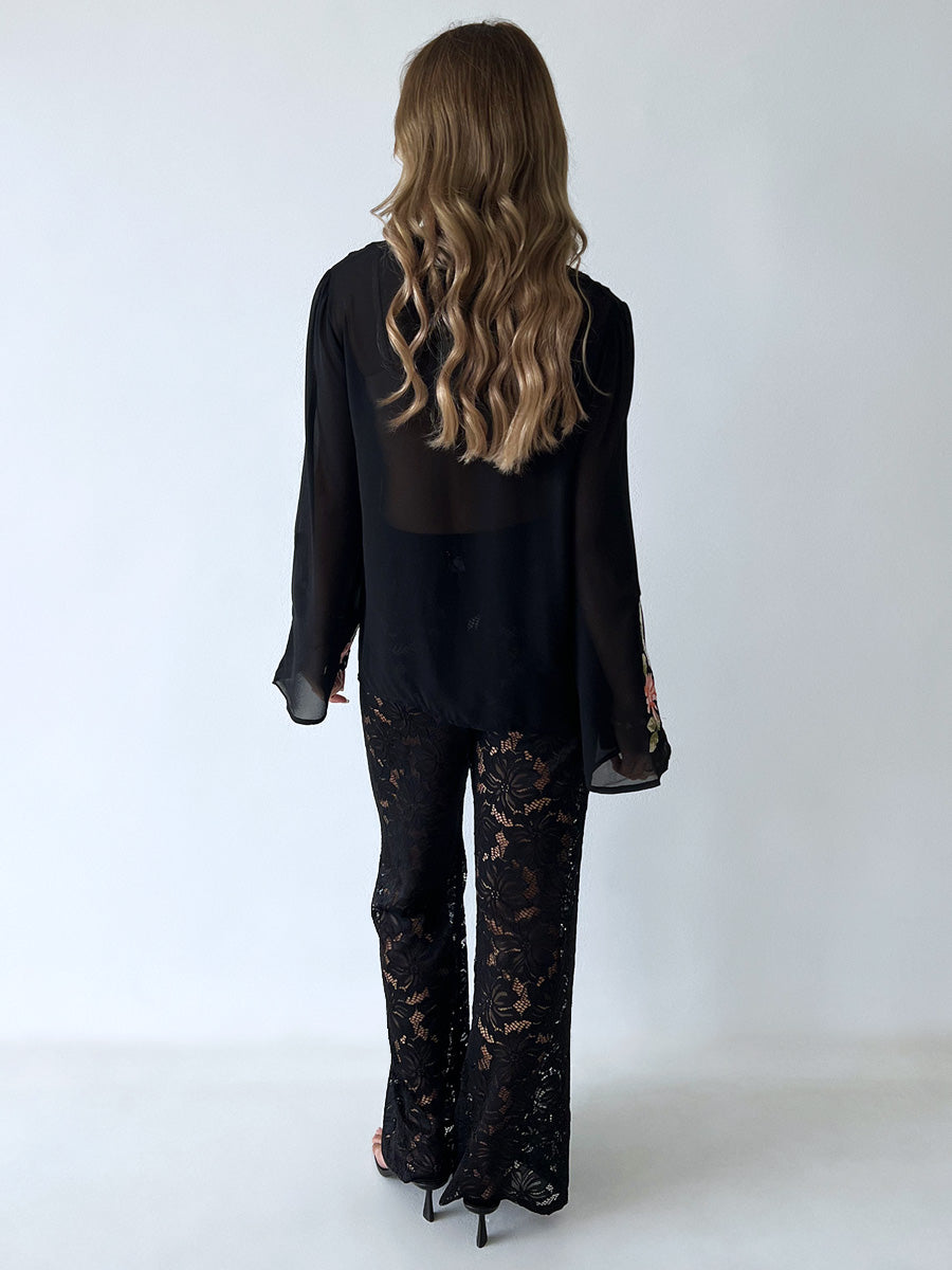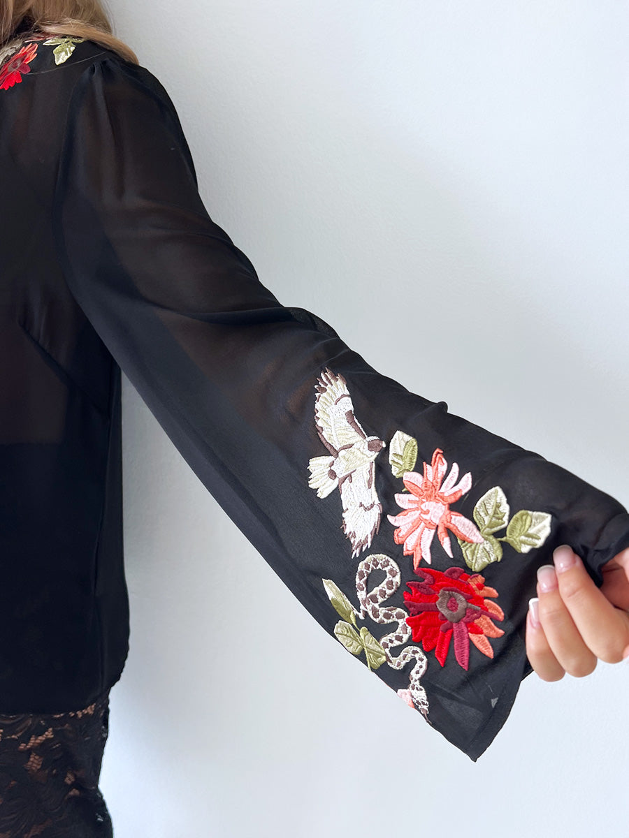 A sheer black blouse with sweeping bell sleeves and a soft scoop neckline, finished with brass-look buttons for a touch of vintage grit. Embroidered with hand-painted floral and desert motifs—each one a quiet bloom in barren soil.