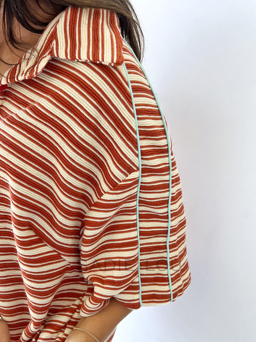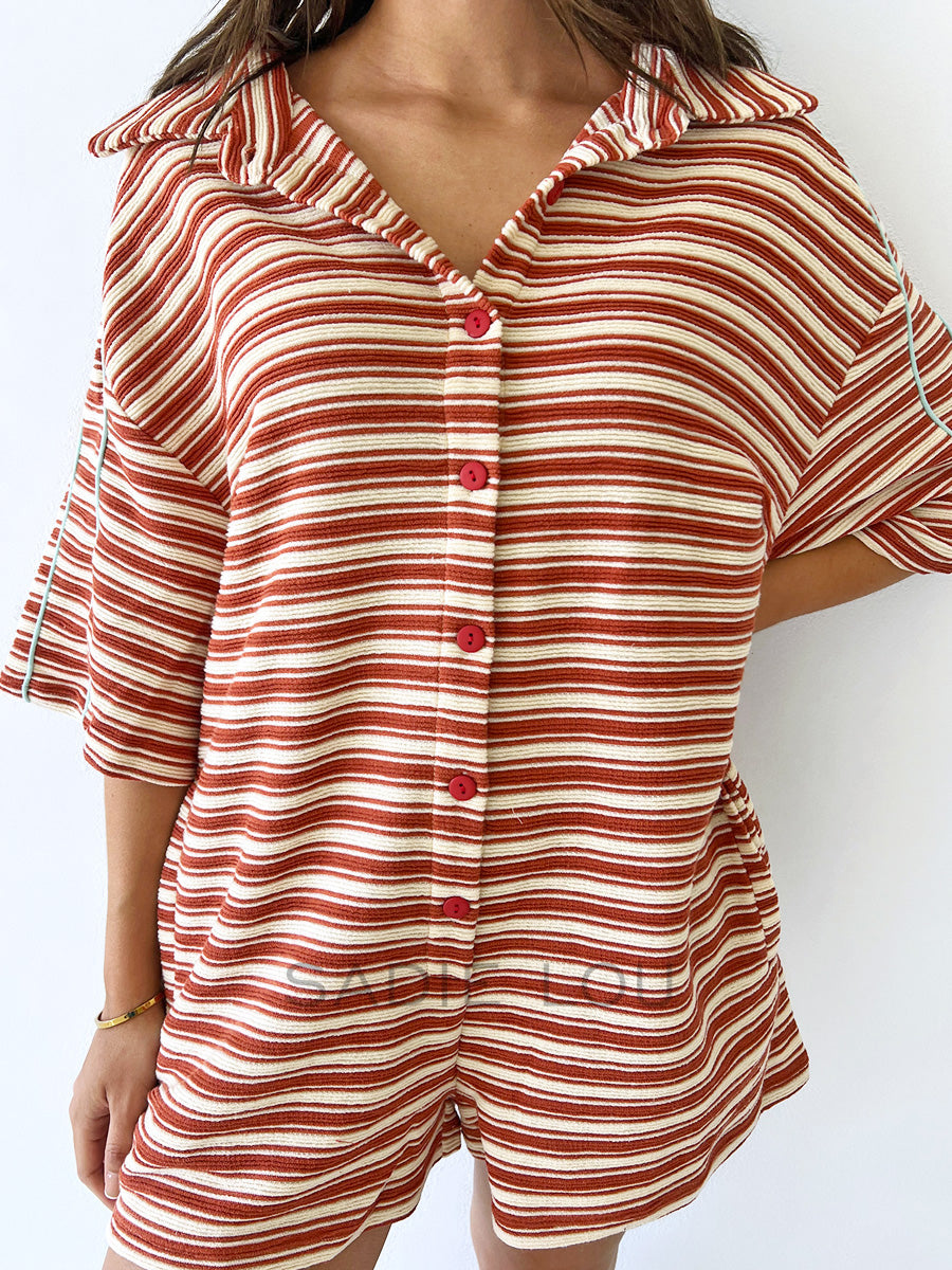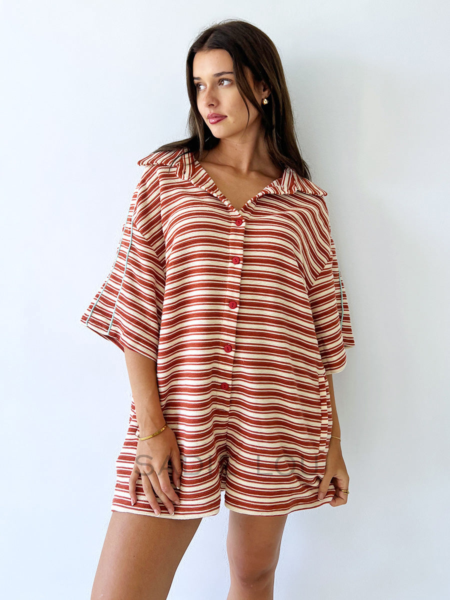 Made from a soft terry towelling–style fabric, this playsuit blends 52.7% polyester and 47.3% cotton for comfort and durability. Designed with a classic collar, short sleeves, and a button-up front, it features playful colour blocking, functional pockets, and blue detailing along the sleeves for a sporty finish. Easy, fun, and perfect for warm-weather days.