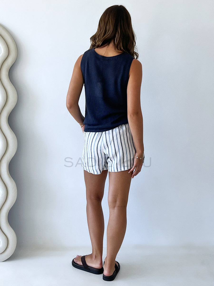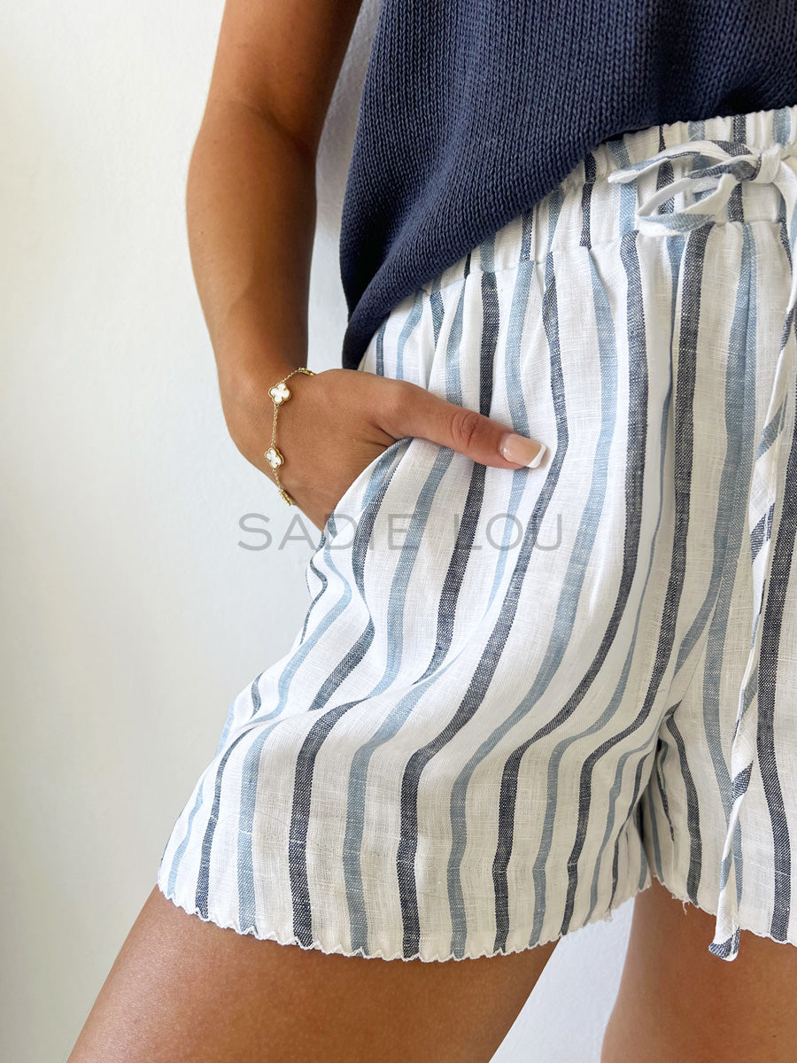 Effortlessly refined and easy to wear, these shorts are crafted from 100% breathable linen in a crisp white base with two vertical blue stripes in contrasting tones. Designed for comfort and warm-weather ease, they feature delicate scallop detailing along the bottom hem, adding a soft, feminine finish. Lightweight and versatile, they’re perfect for relaxed days or styled as a matching set.
