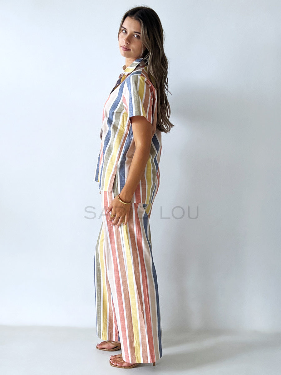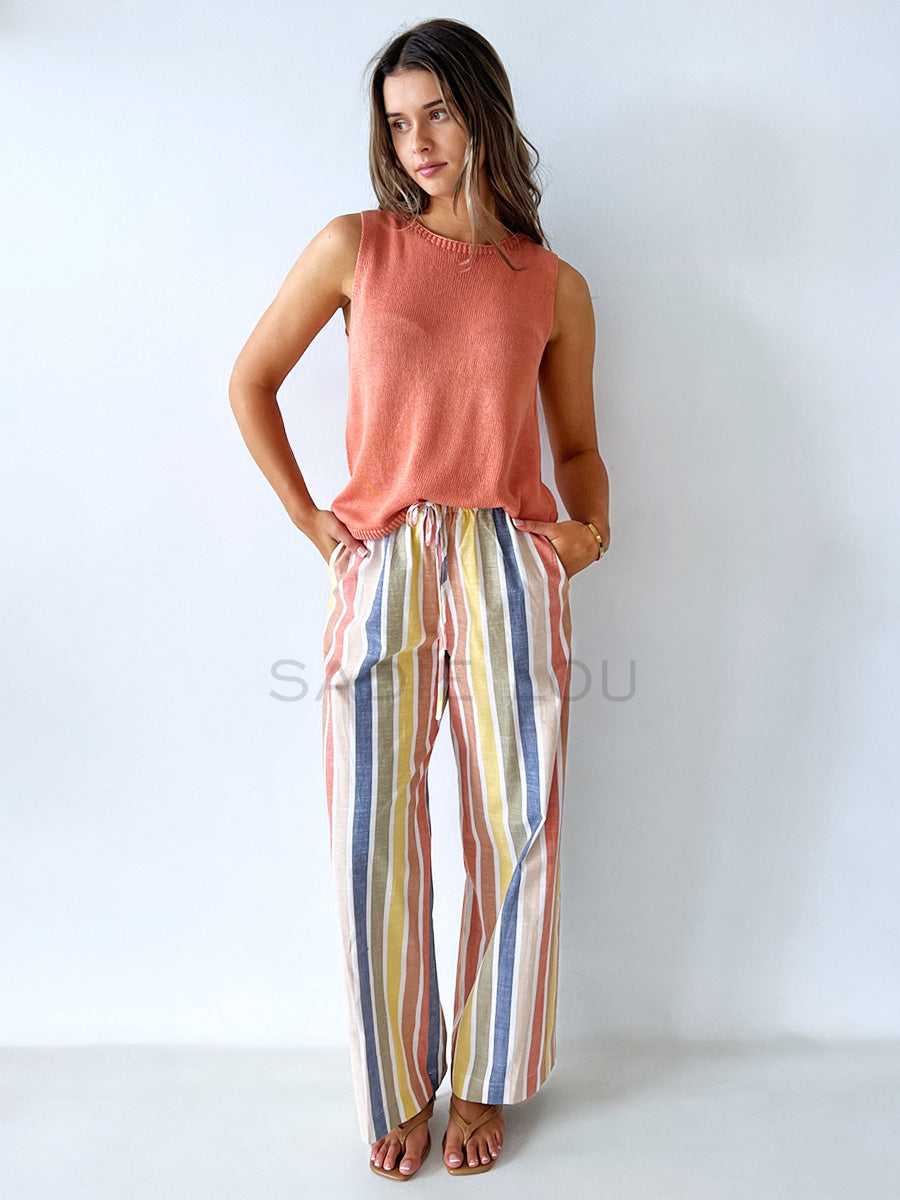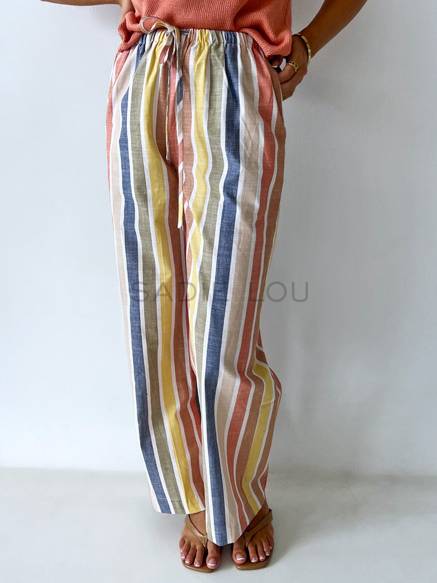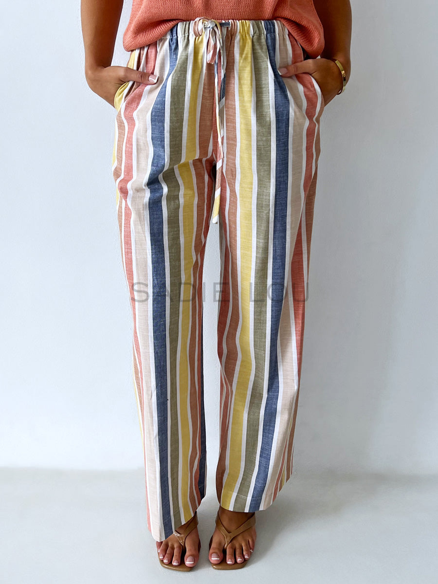 Introduce a sophisticated touch to your casual wardrobe with the Sofie Stripe Long Pants. Designed to match the iconic Sofie Shirt, these trousers feature the same captivating multi-coloured stripe pattern on light, airy 100% cotton fabric.