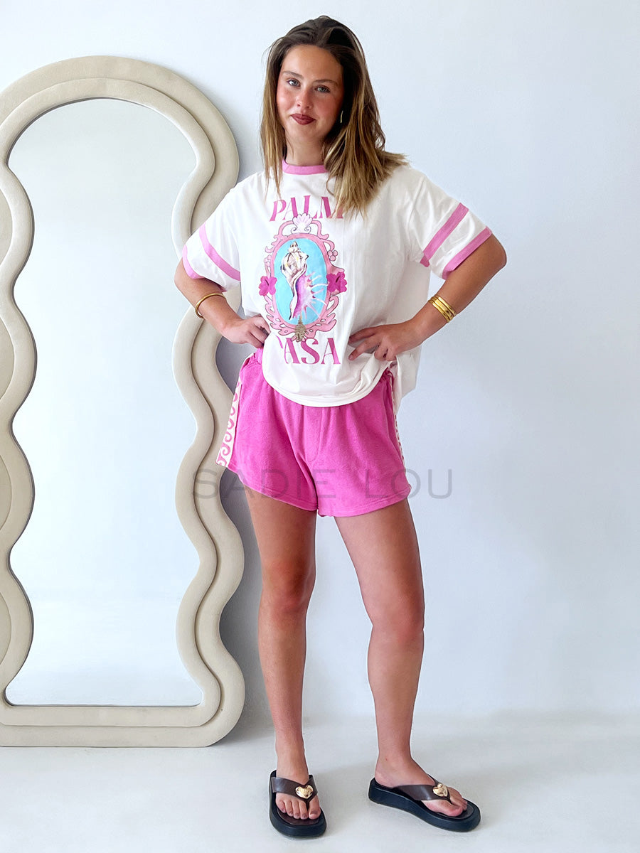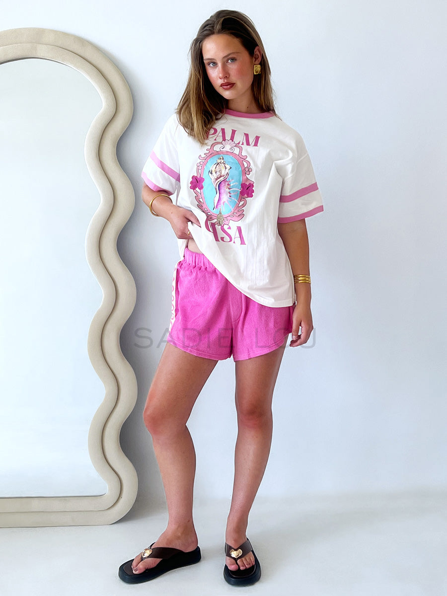 It's crafted from luxuriously soft 100% combed cotton and features a relaxed, oversized fit that feels incredible. The front is stamped with our signature 'Clam Casa' print, perfectly framed by short sleeves detailed with crisp Barbie pink striped binding.