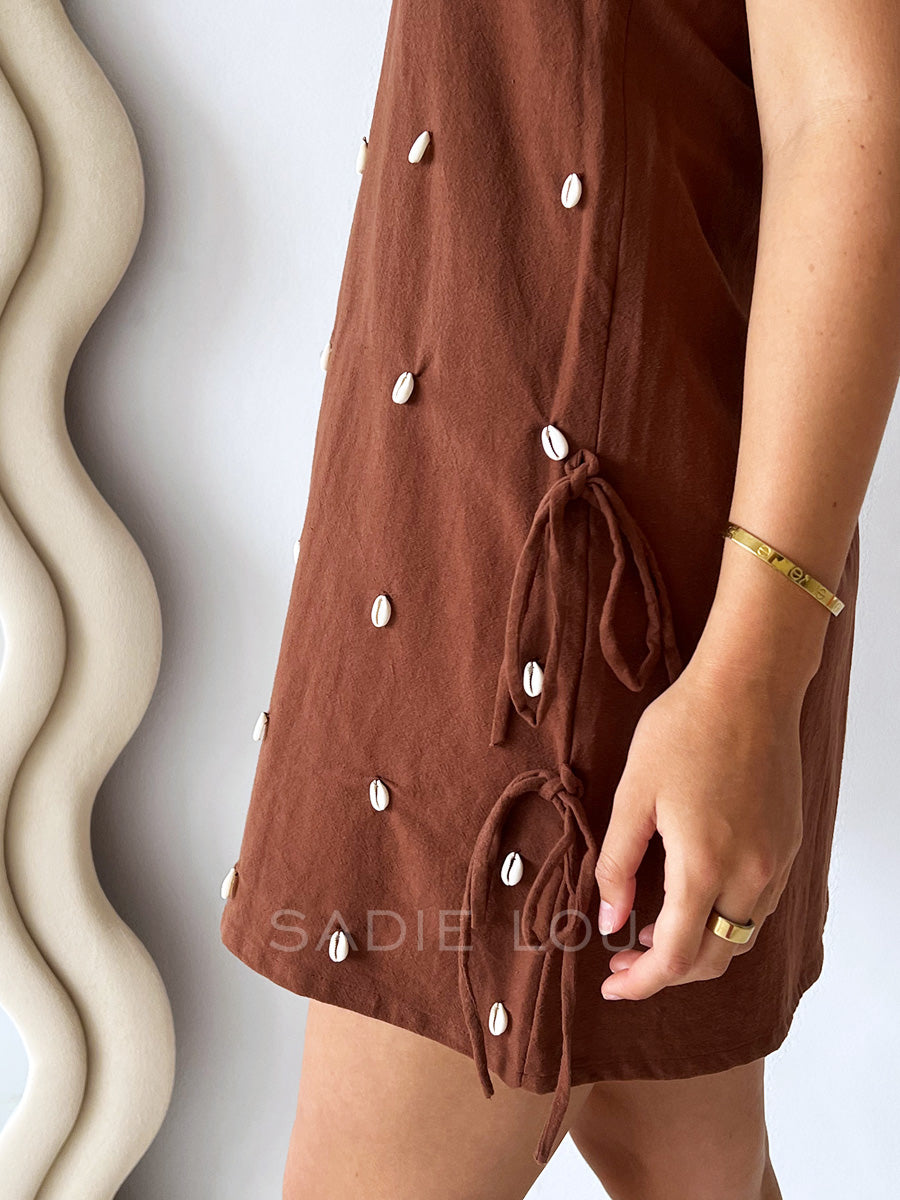 Features: Hand-Beaded Cowrie Shells on Front, Spaghetti Tie Shoulder Straps, Side Bow Ties