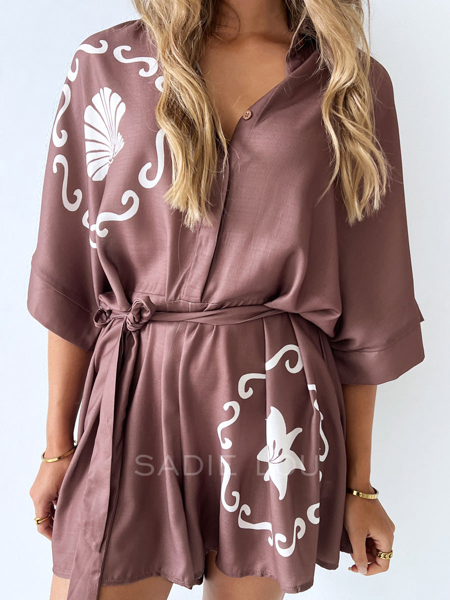 This chic brown playsuit brings effortless style with a subtle coastal twist. Featuring a statement seashell detail on the right bust, it’s designed with a half button-up front and a classic collar for a refined touch. The adjustable tie around the waist creates a flattering silhouette, while the shorts keep it easy and comfortable for warm days.