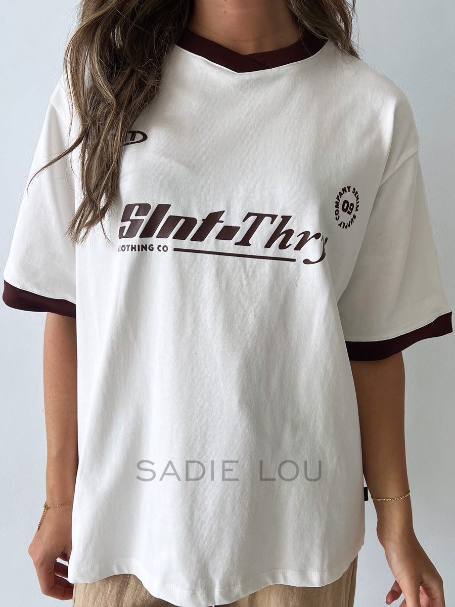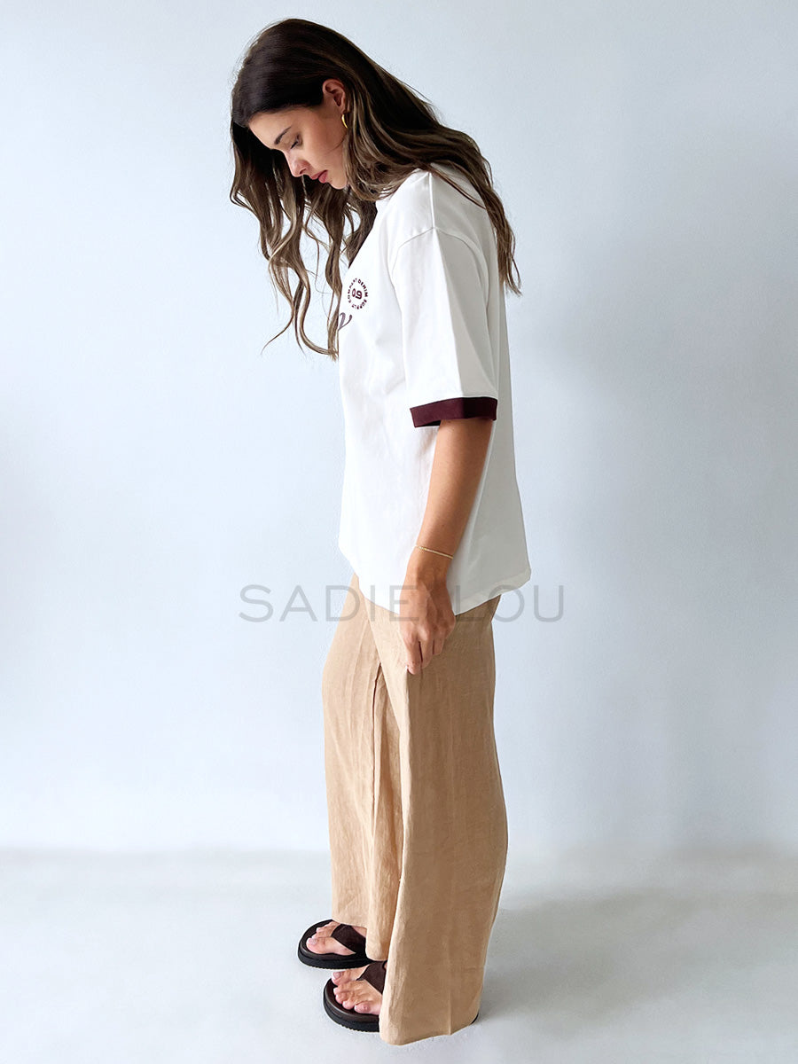 The Carson Tee will elevate your wardrobe this autumn! Made from a heavy weight cotton jersey, this tee features and oversized fit with contrast sleeve panels, v neckband with branded chest print. Pair back with your Jade Baggy Jeans for the ultimate casual but cool girl look.