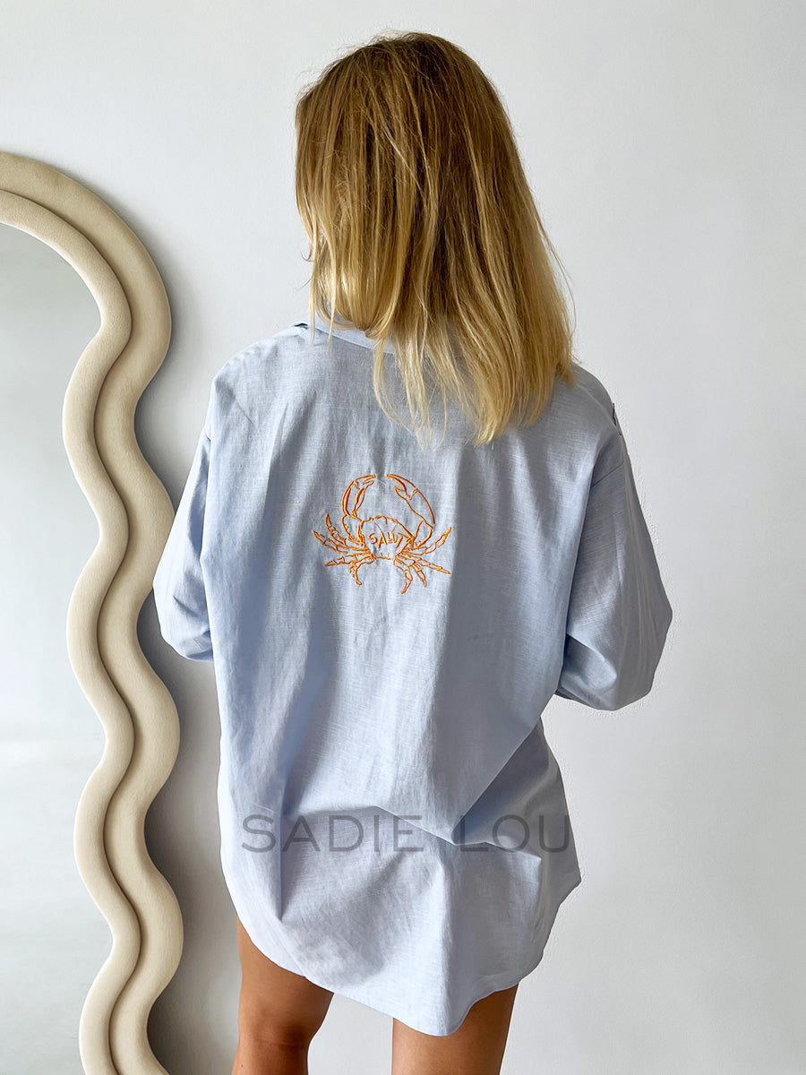 What makes the Nacida truly special is the artistry in the detail. A beautifully hand-embroidered orange crab motif is placed on the back, bringing a playful yet sophisticated texture and personality to the crisp fabric. This intricate detail celebrates the art of slow fashion and thoughtful design, reflecting our commitment to quality craftsmanship and the coastal lifestyle that inspires everything we create.